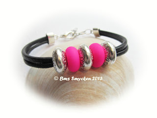 Läderarmband med bulliga antiksilverfärgade delar och rosa neonglaspärlor, längd: ca 17,5-18cm. Pris: 180kr.